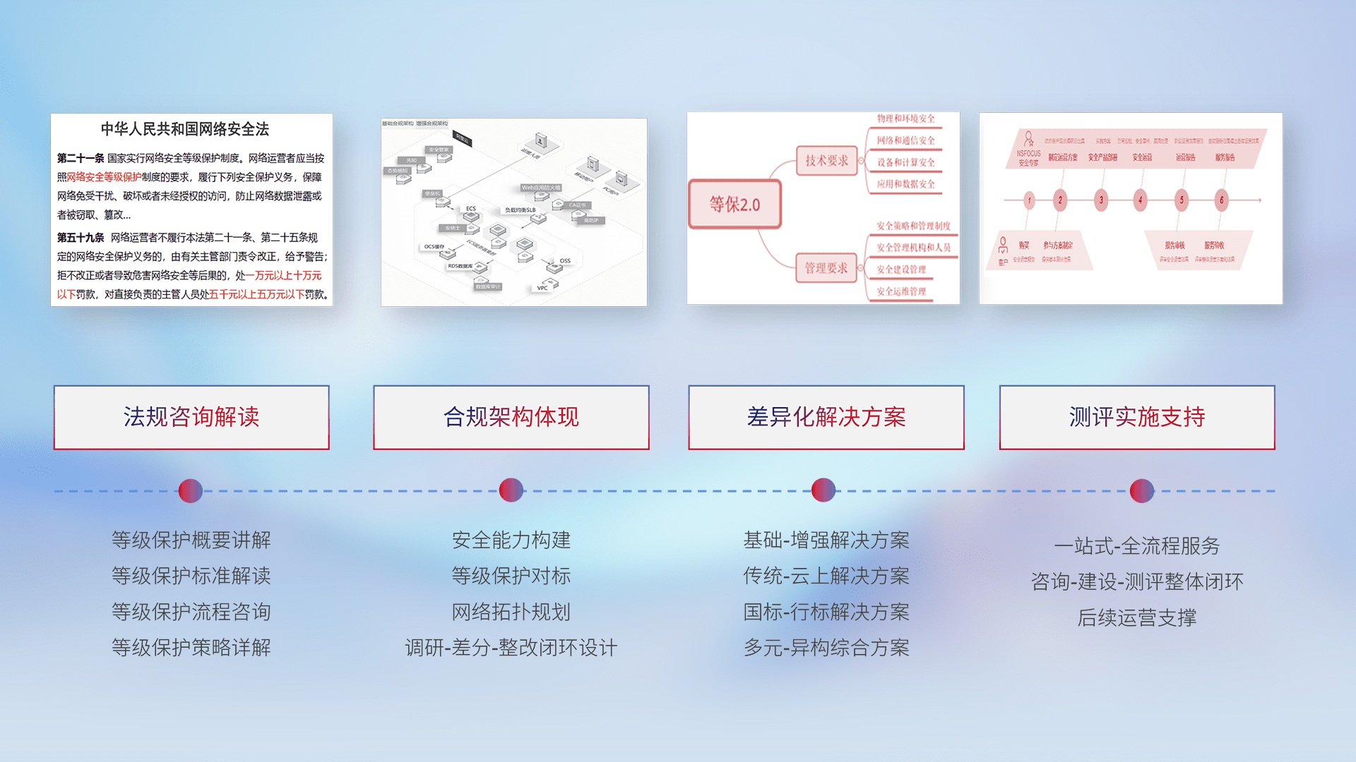 通过专业的法律咨询解读、、合规架构体现、、差异化解决方案、、测试实施支持等服务,,,为客户量身打造等保合规体系。。。